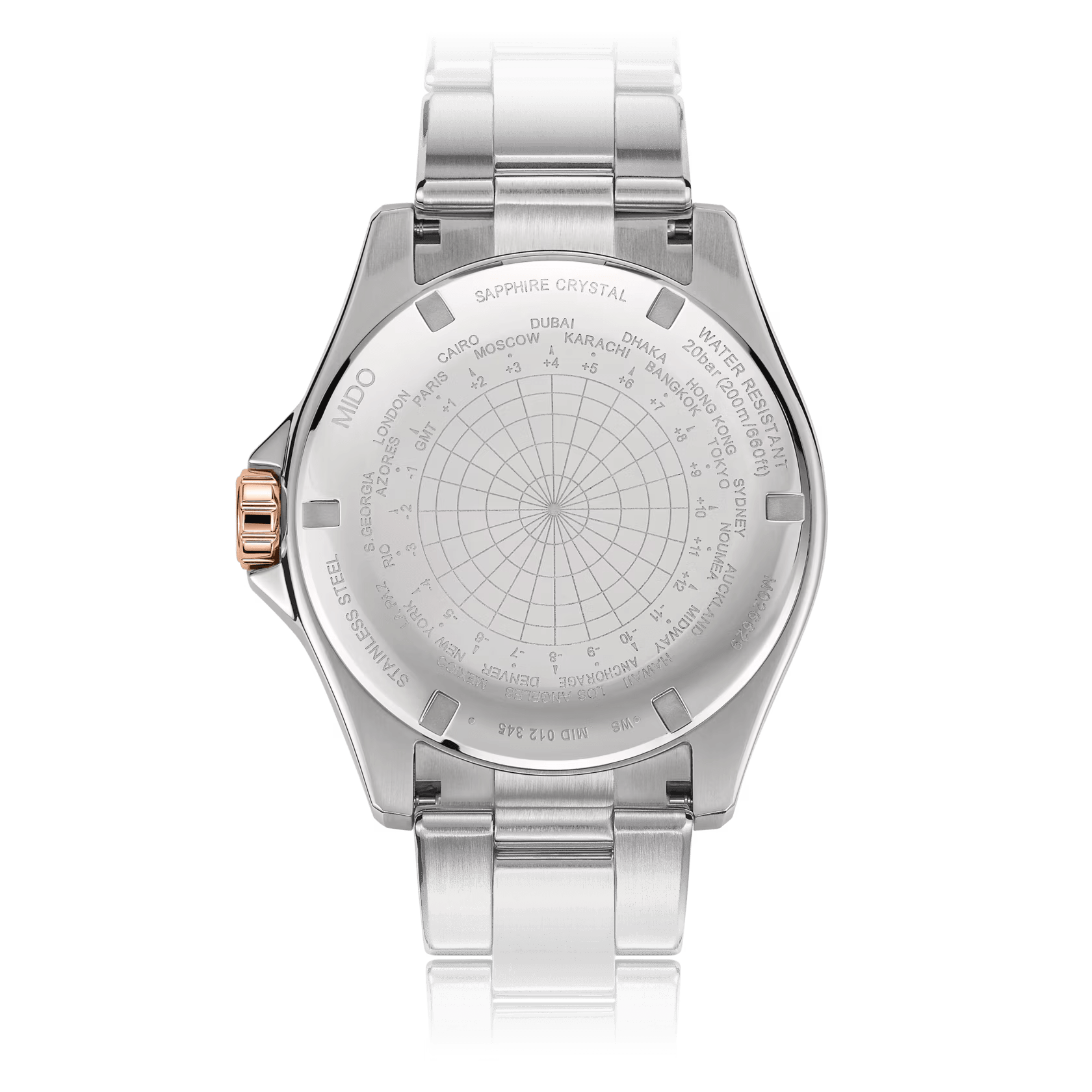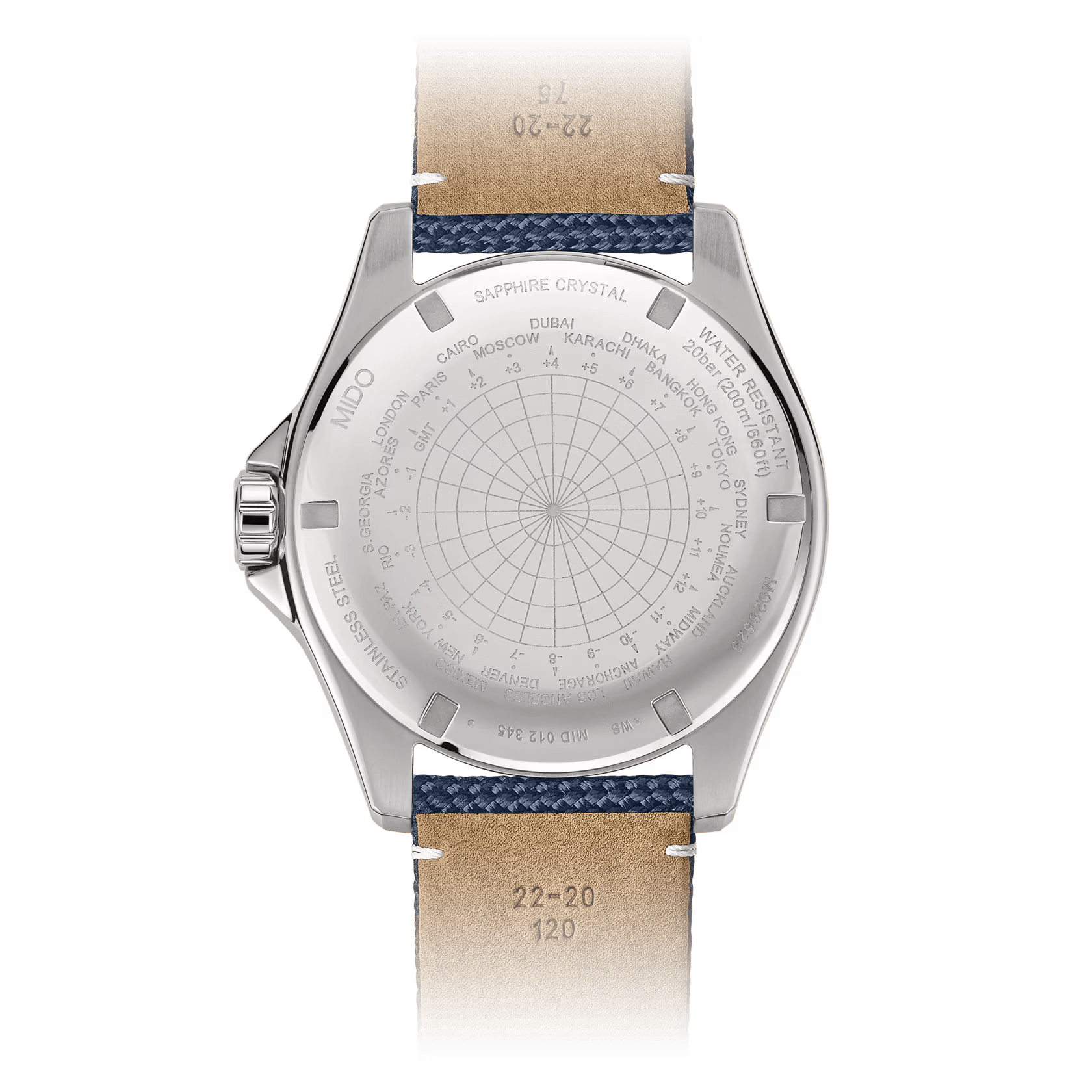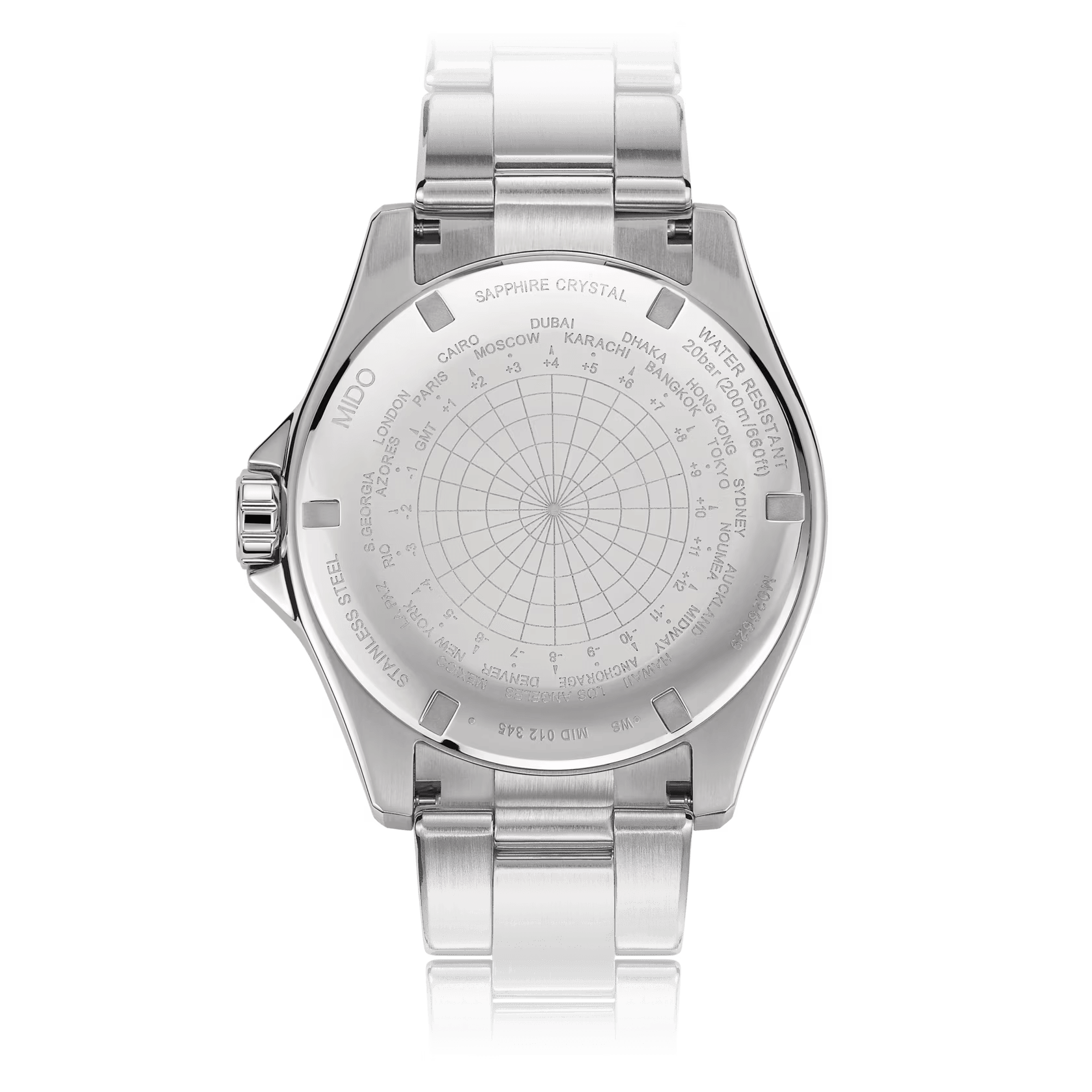 MIDO enrichit sa collection de montres de plongée Ocean Star avec une version équipée de la fonction GMT très pratique. Elle affiche clairement l'heure dans deux fuseaux horaires différents : l'heure du domicile et l'heure locale. Au dos de la montre suisse sportive, équipée du mouvement automatique Calibre 80, qui offre une réserve de marche allant jusqu'à 80 heures, MIDO a gravé les indications des fuseaux horaires. La fonction GMT, extrêmement simple à utiliser, offre deux fois plus de liberté à ceux qui sont au bord de l'océan ou en train de vivre une aventure pleine d'adrénaline.