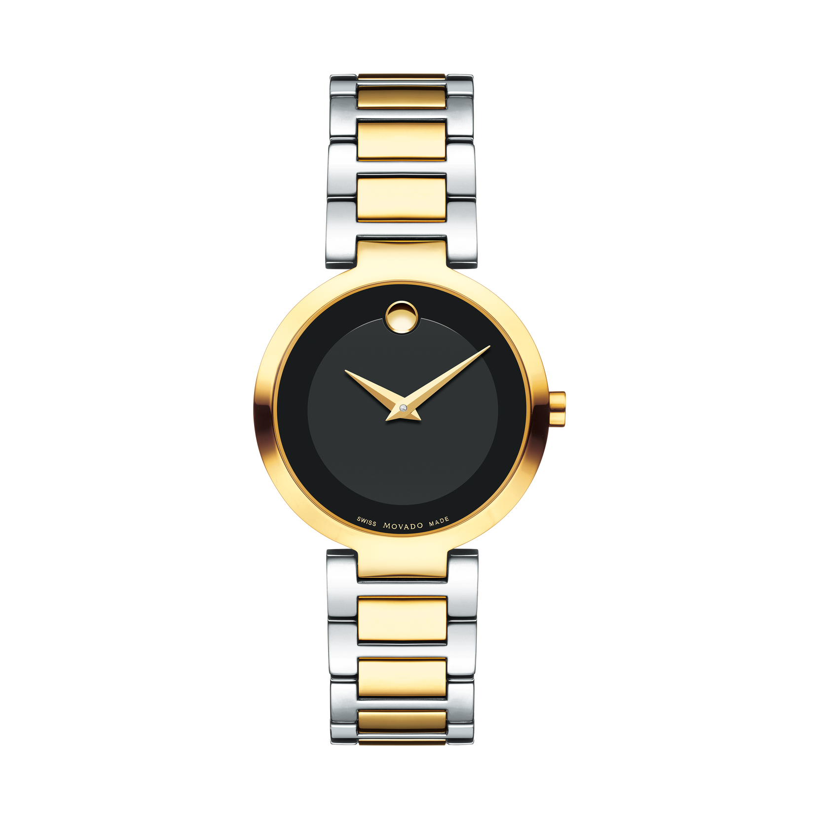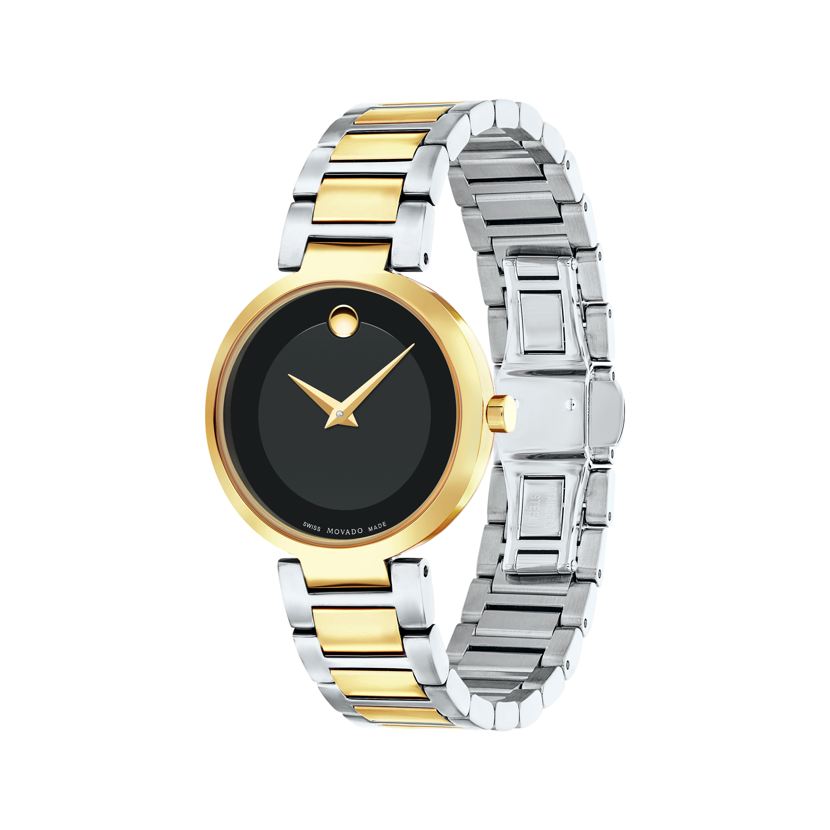 Women's Movado Collection quartz watch, 28 mm stainless steel and yellow gold PVD-finished case with wide, centered strap holder extensions, black Museum dial with tone-on-tone outer ring and gold-toned dot and hands, stainless steel and yellow gold PVD-finished link bracelet with deployment clasp.