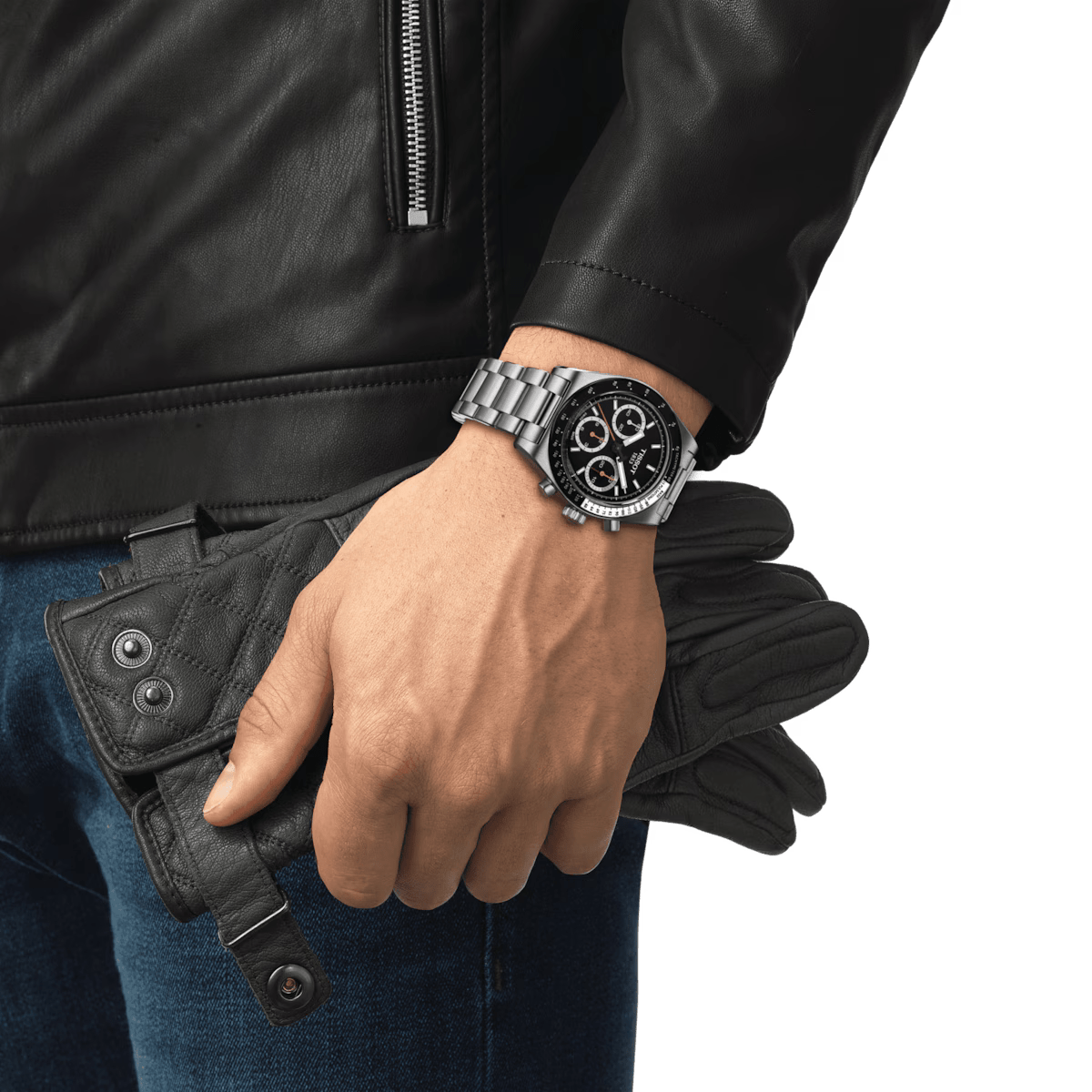 La Tissot PR516 Chronographe Mécanique : un clin d'œil au distingué modèle Tissot de 1970. Fabriquée avec un boîtier en acier inoxydable de 41 mm et un verre saphir de style boîte en verre, cette montre témoigne d'un savoir-faire sophistiqué. En son cœur se trouve un mouvement suisse à remontage manuel, visible à travers le fond ouvert, mettant en valeur la mécanique complexe. Le cadran, doté d'index et d'aiguilles recouverts de Super-LumiNova®️, assure la lisibilité dans n'importe quel environnement. Un tachymètre sur la lunette ajoute une touche de fonctionnalité. Son design polyvalent est complété par un bracelet bombé en acier inoxydable doté d'un système d'interchangeabilité rapide, parfait pour passer des réunions d'affaires aux sorties décontractées. Le chronographe mécanique PR516 est une pièce exquise pour les connaisseurs de montres qui apprécient le design intemporel et la précision mécanique.