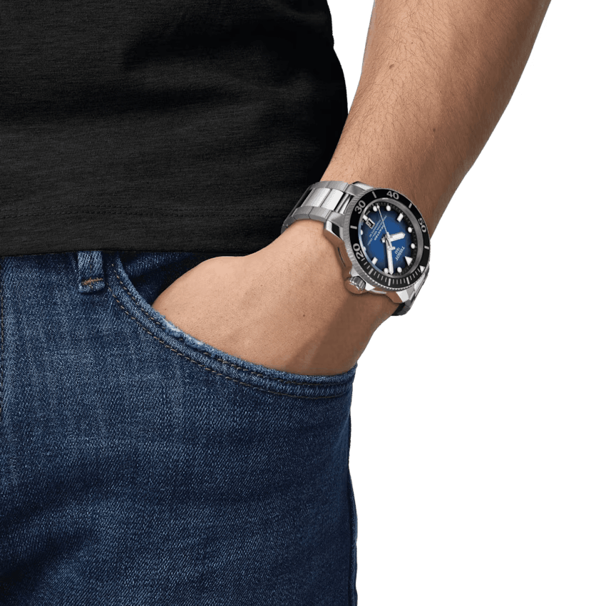 La famille des montres de plongée Tissot accueille une nouvelle version évoluée et technique, la Seastar 2000 Professional. Son profil réunit tous les atouts d'une montre performante : étanchéité à 600 mètres, valve à hélium, certification ISO 6425, calibre automatique à longue réserve de marche, lunette en céramique. Avec son cadran bleu dégradé à motifs de vagues et son design sans compromis, c'est aussi un garde-temps destiné aux amateurs de style nautique extrême.