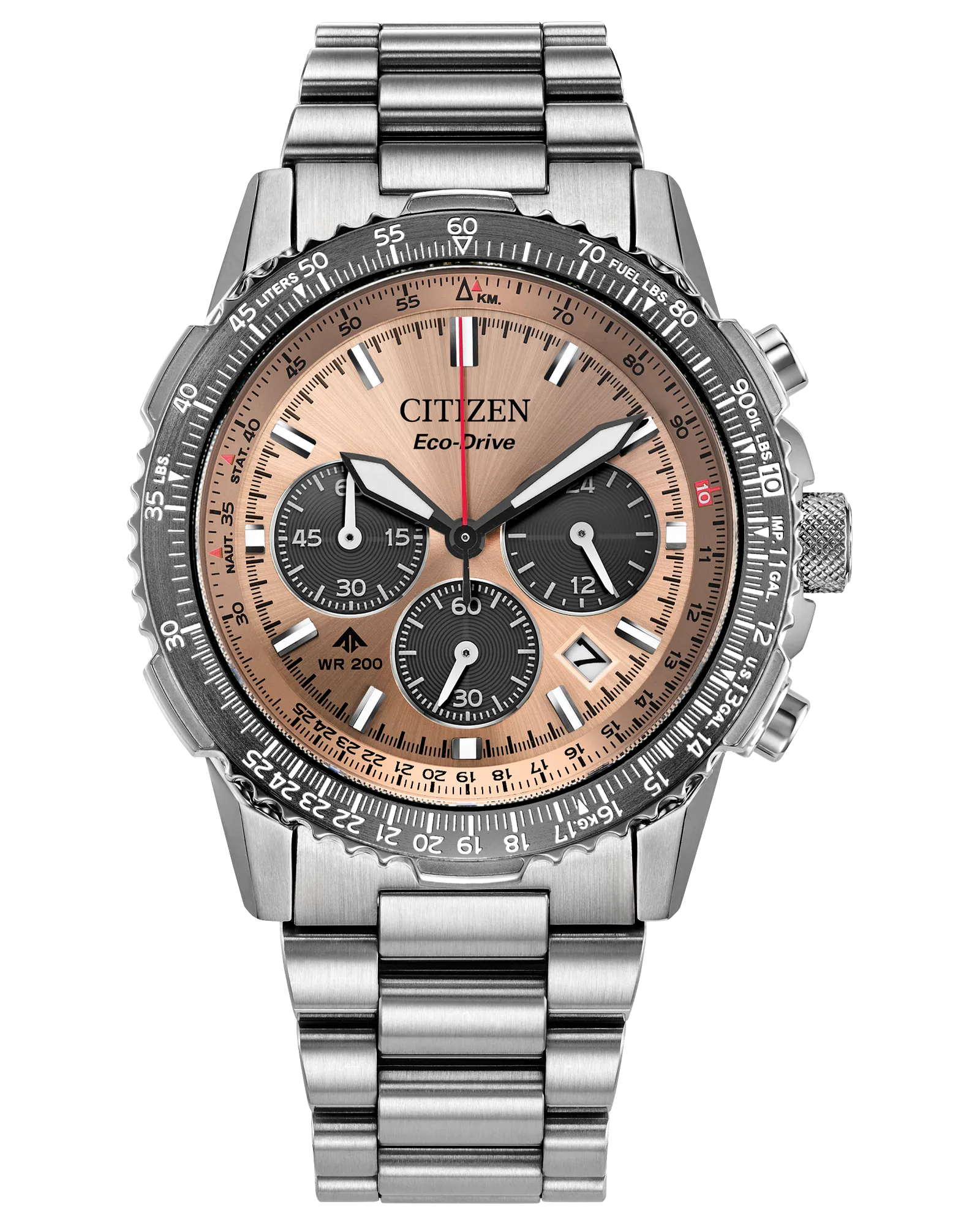 On the dial, a salmon colourway with red, black, and white accents adds to the watch's superior legibility, while a sapphire crystal and 200m of water resistance protect it all. Functions include a 1/5 second chronograph measuring up to 60 minutes, 12/24-hour time displays, and a date indicator, all powered by our Eco-Drive technology – sustainably powered by light and never needing a battery. Calibre B620.