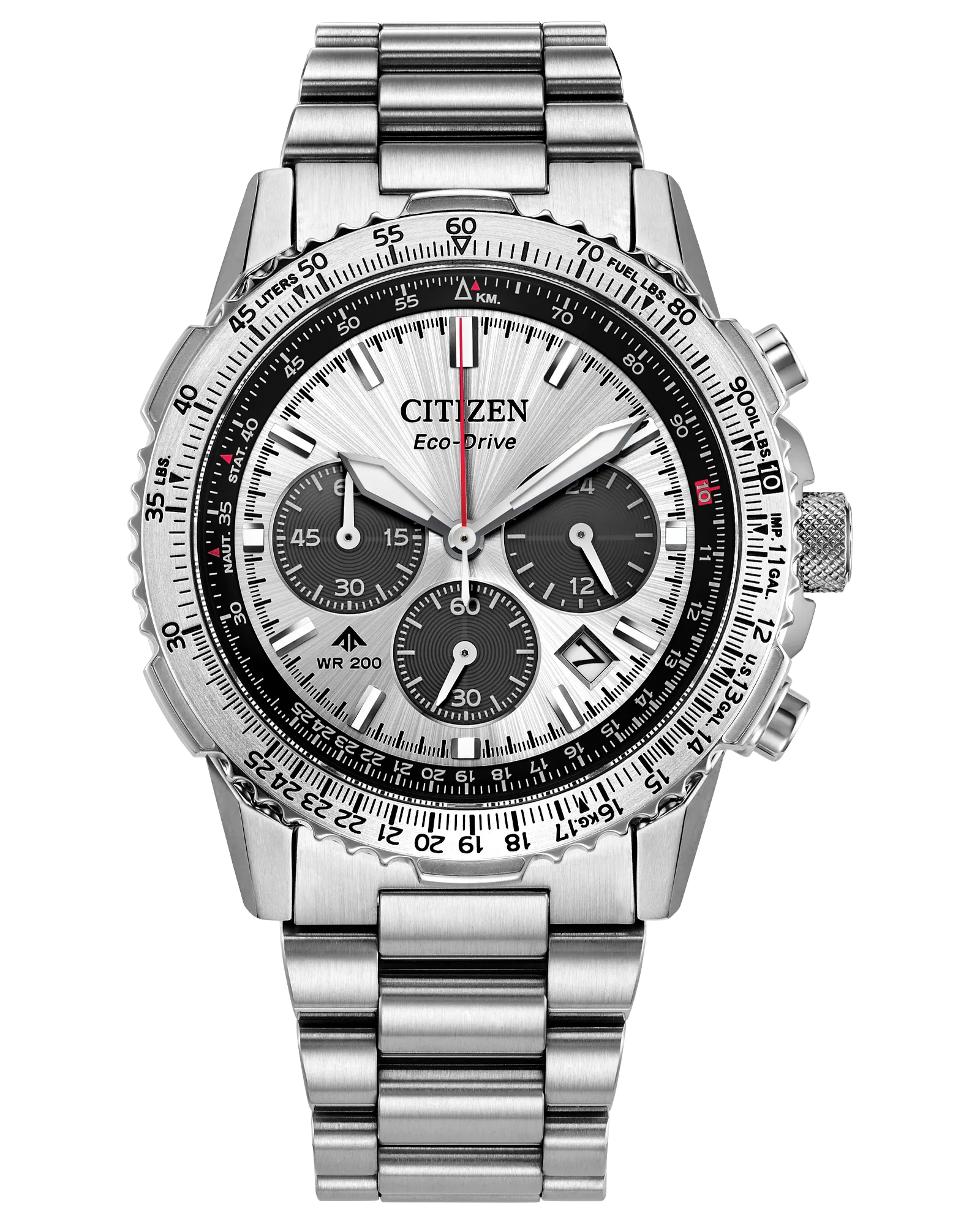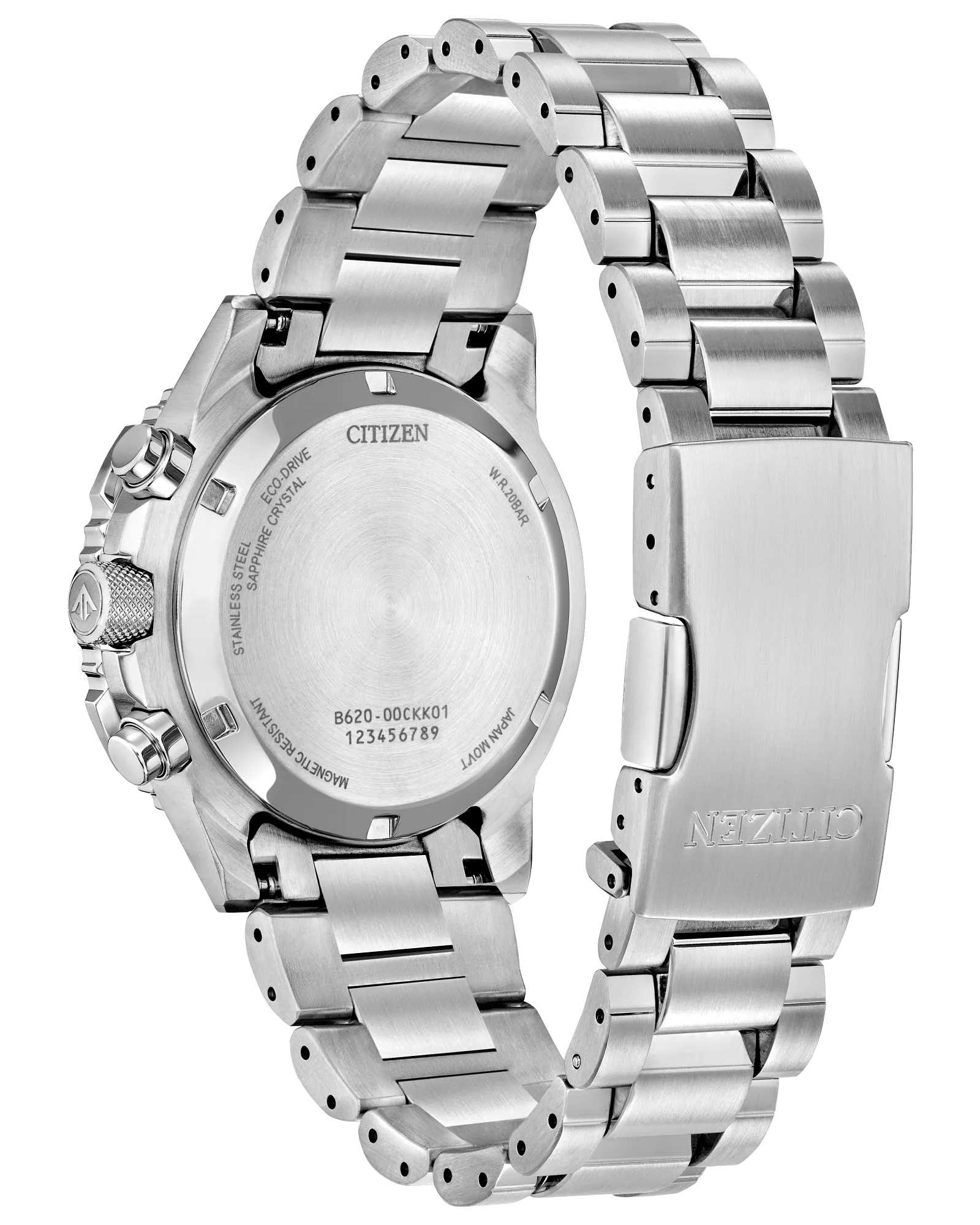 0On the dial, a silver-tone colourway with red, black, and white accents adds to the watch's superior legibility, while a sapphire crystal and 200m of water resistance protect it all. Functions include a 1/5 second chronograph measuring up to 60 minutes, 12/24 hour time displays, and a date indicator, all powered by our Eco-Drive technology– sustainably powered by light and never needing a battery. Calibre B620.