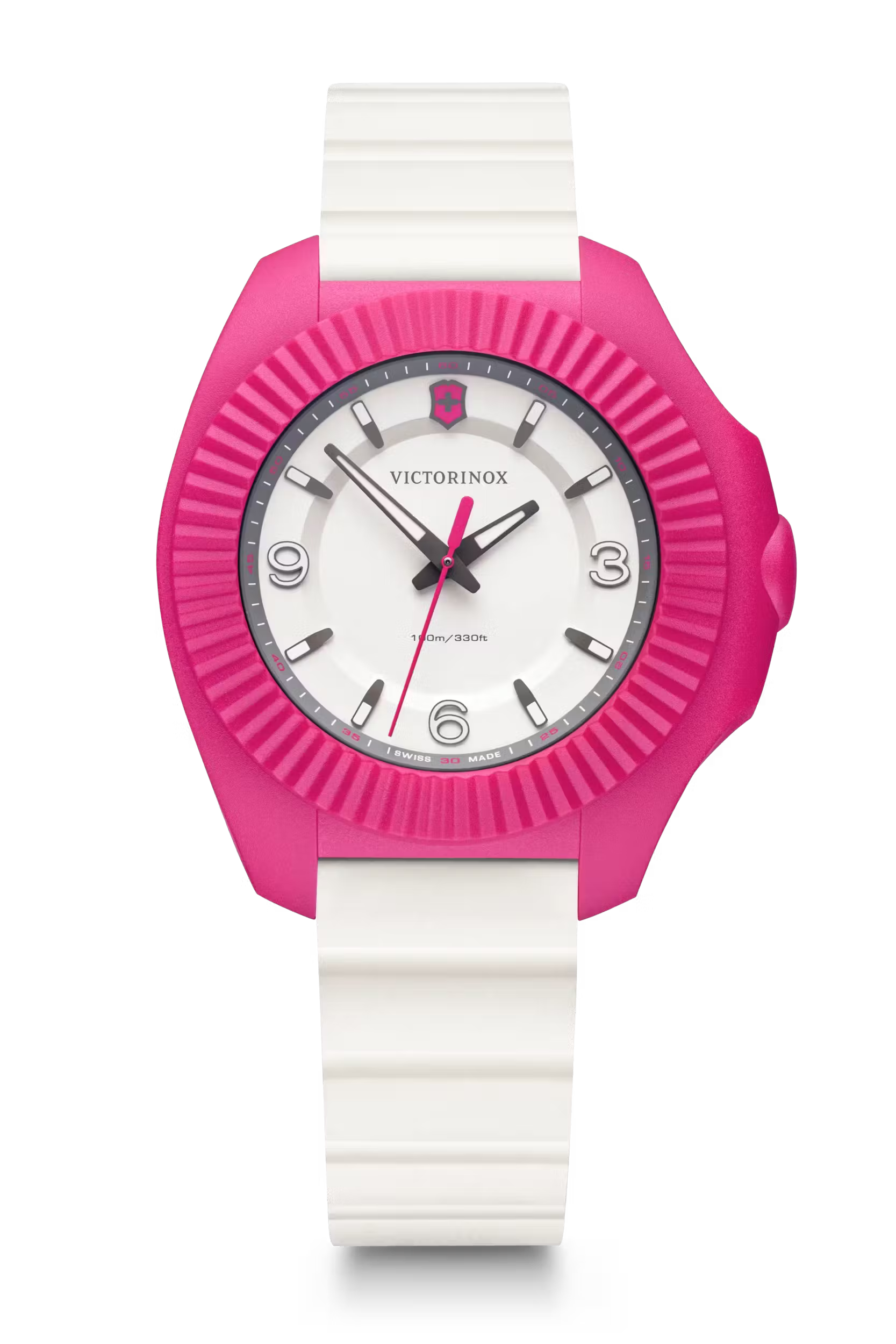 Introducing the ultimate in lightweight, adventure-tough watches: the I.N.O.X. V. Forward thinking, functional and beautiful in form, this Swiss made timepiece sets a new benchmark in feminine horology. Taking the bold iconic design of the original I.N.O.X. V, it reinvents it for the discerning female globe-trotter. Weighing in at 32% lighter, and 33% slimmer, with a resistant rubber strap with easy release bar system for smooth strap removal and replacement, it’s effortless wristwear for her.